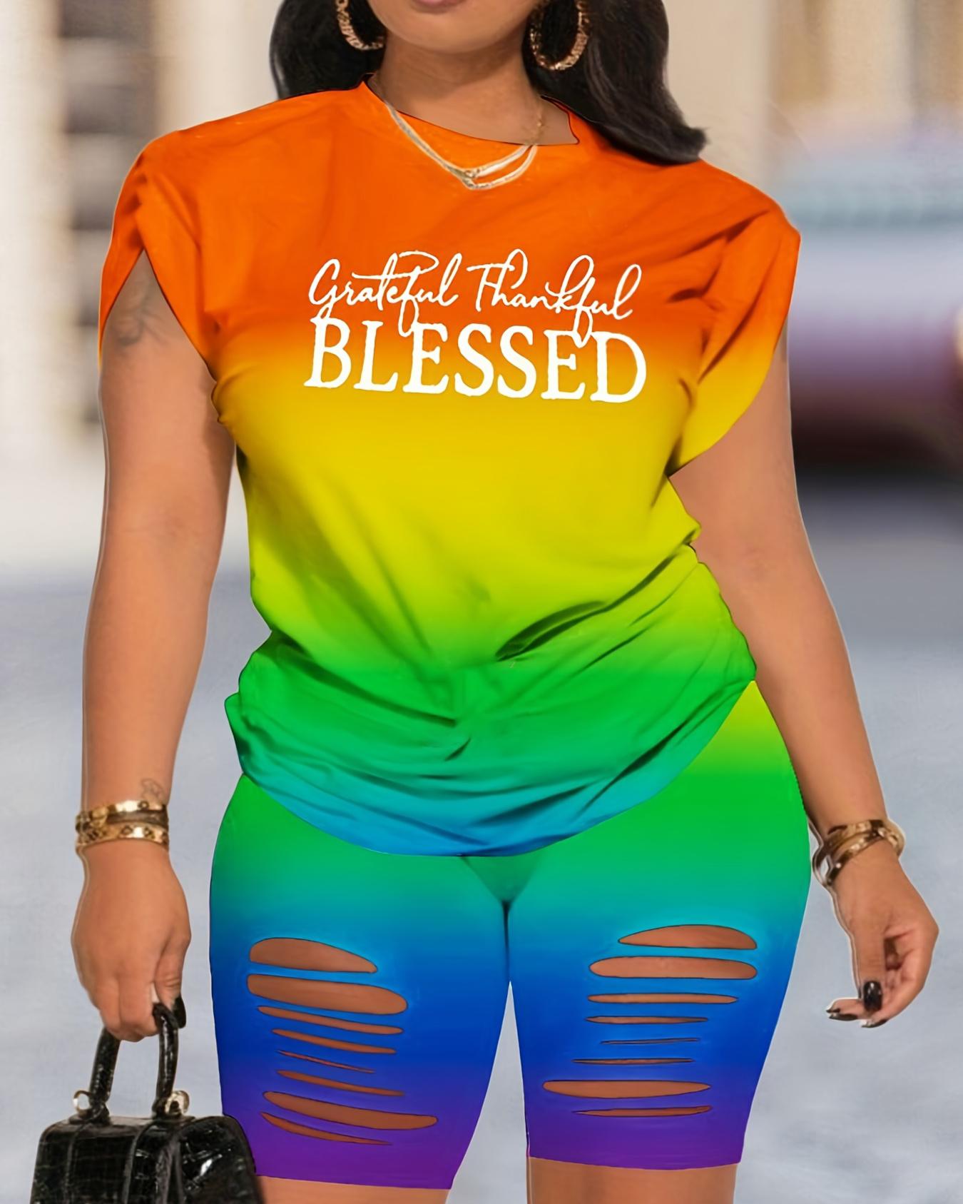 Plus Size Grateful Thankful Blessed Print Ombre Short Sleeve Top & Ladder Cutout Shorts Set