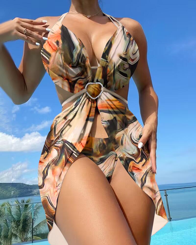 3PCS Print Halter Bikini Swimsuit Cover Ups