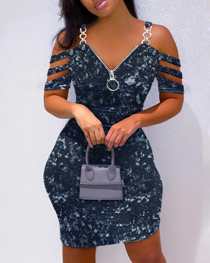 Tie Dye Print Cold Shoulder Zipper Fly Bodycon Dress