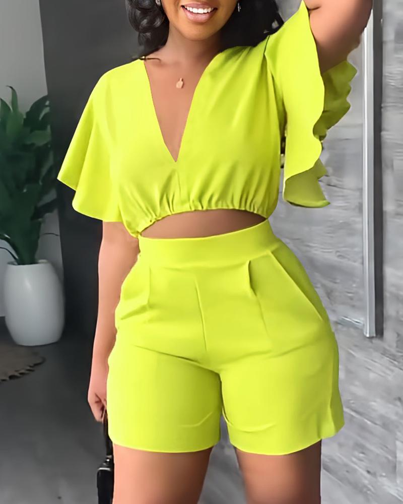 Style:Casual Type:Shorts Set Material:Polyester Neckline:V-Neck Sleeve Style:Flutter Sleeve,Short Sleeve Length:Above Knee Pattern Type:Plain Decoration:Flutter Sleeve Fit Type:Skinny Occasion:Daily Package Include:1* Shorts Set Fabric Elasticity:Non-Stretch Sheer:No Care Instructions:Machine wash or professional dry clean