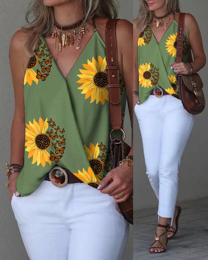 Sunflower Butterfly Print Wrap Tank Top