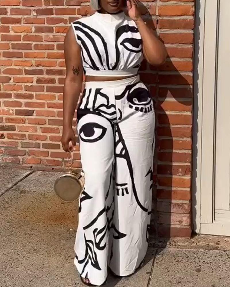 Figure Print Crop Top & Wide Leg Pants Set