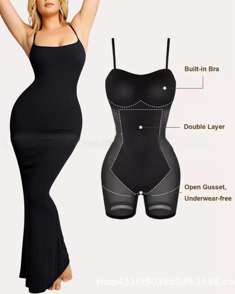 Style:Chic Type:Shapewear Material:Polyester Neckline:U-Neck Length:Maxi Pattern Type:Plain Decoration:Sheer Mesh Fit Type:Skinny Occasion:Daily Package Include:2-In-1 Shapewear Dress Sheer:Semi-Sheer Care Instructions:Machine wash or professional dry clean