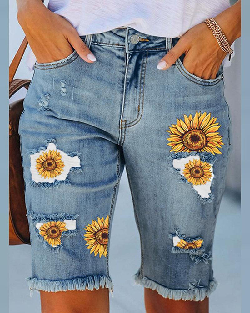 Style:Chic,Denim Type:Denim Shorts Material:Denim Length:Knee-Length Pattern Type:Sunflower Decoration:Pocket,Raw Hem Fit Type:Regular Occasion:Daily Package Include:1*Denim Shorts Fabric Elasticity:Slight Stretch Sheer:No Care Instructions:Machine wash or professional dry clean