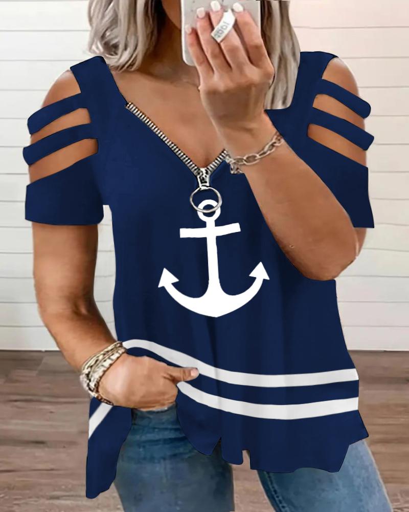 Style:Casual,Chic Type:Tee Material:97%Polyester,3%Spandex Neckline:Cold Shoulder Sleeve Style:Short Sleeve Length:Regular Pattern Type:Anchor,Colorblock,Contrast Paneled Decoration:Cutout,Zipper Fit Type:Regular Occasion:Daily Package Include:1*T-Shirt Fabric Elasticity:Medium Stretch Sheer:No Care Instructions:Machine wash or professional dry clean