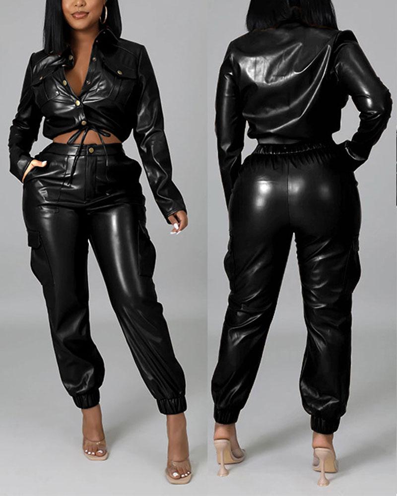 Style:Casual Type:Pants Sets Material:100%PU Leather Neckline:Turn-down Collar Sleeve Style:Long Sleeve Length:Long Pattern Type:Plain Decoration:Button,Zipper,Pocket Fit Type:Regular Occasion:Daily Package Include:1*Pants Set Fabric Elasticity:High Stretch