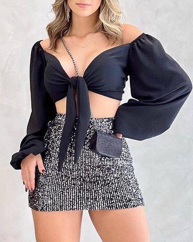 Lantern Sleeve Tied Detail Crop Top & Sequin Skirt Set