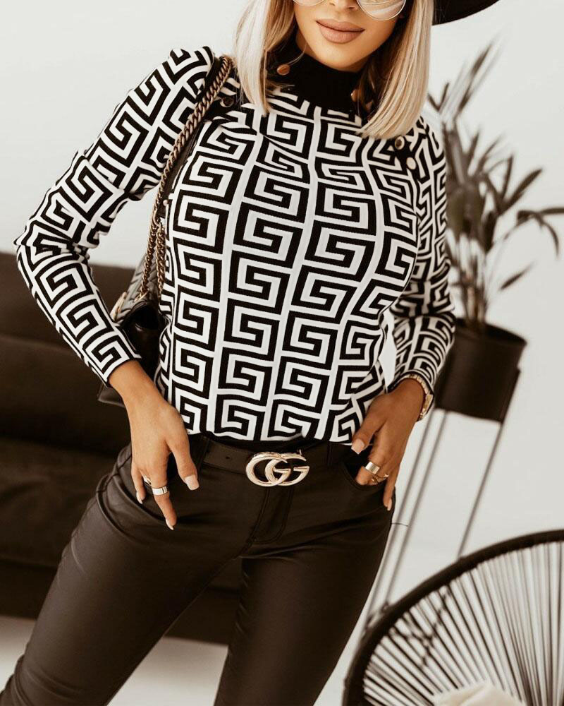 Style:Chic Type:Tee Material:Polyester Neckline:Mock Neck Sleeve Style:Long Sleeve Length:Regular Pattern Type:Geometric Decoration:Button Fit Type:Skinny Occasion:Daily Package Include:1*T-Shirt