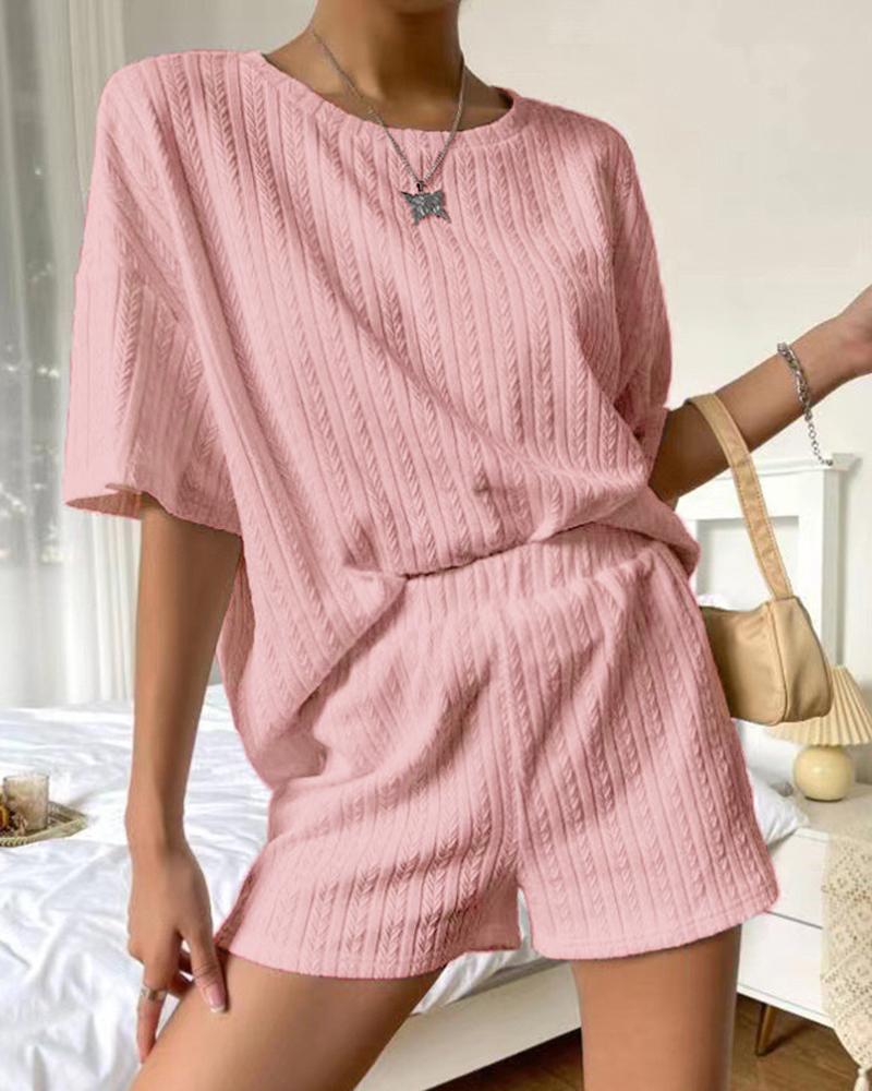 Notch Neck Short Sleeve Textured Drawstring Pajamas Set