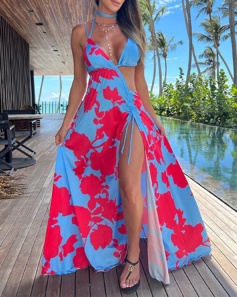 Floral Print Cutout Backless Drawstring High Slit Maxi Dress
