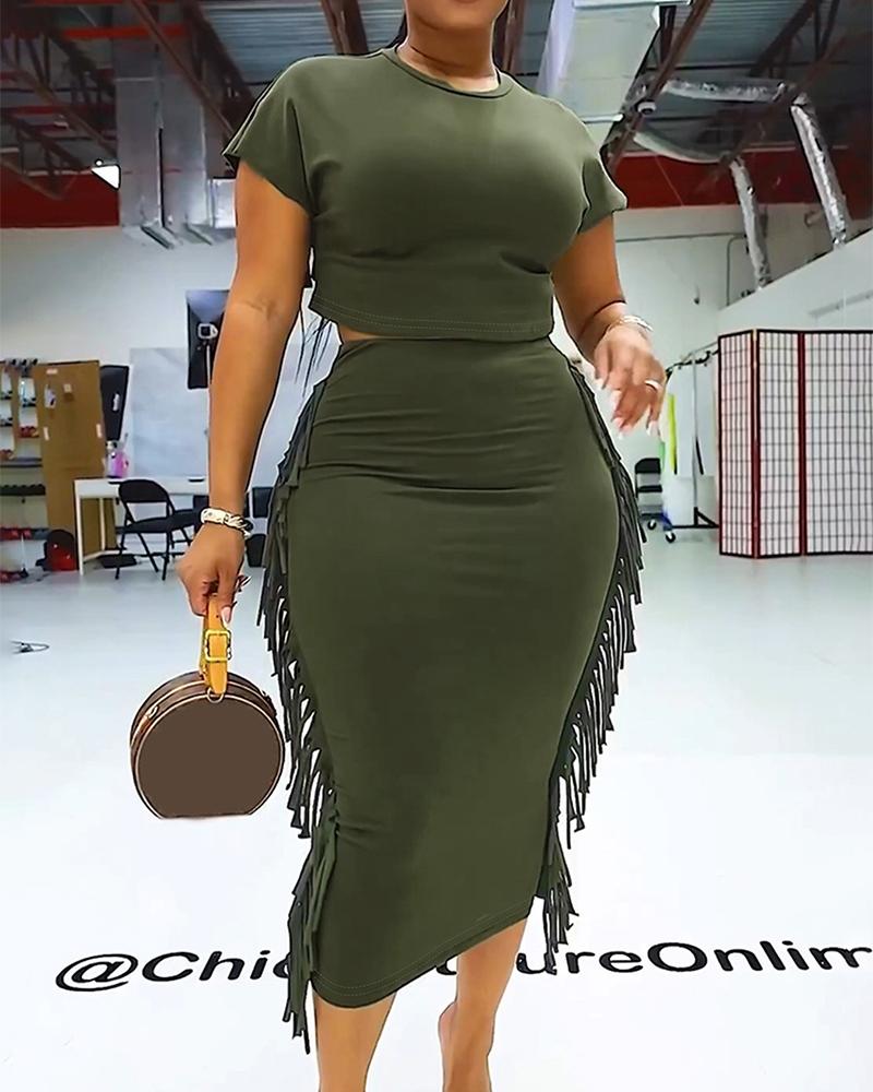 Crop T-shirt & Tassel Design High Waist Skirt Set