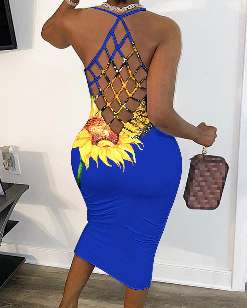 Butterfly Sunflower Print Fishnet Backless Bodycon Dress