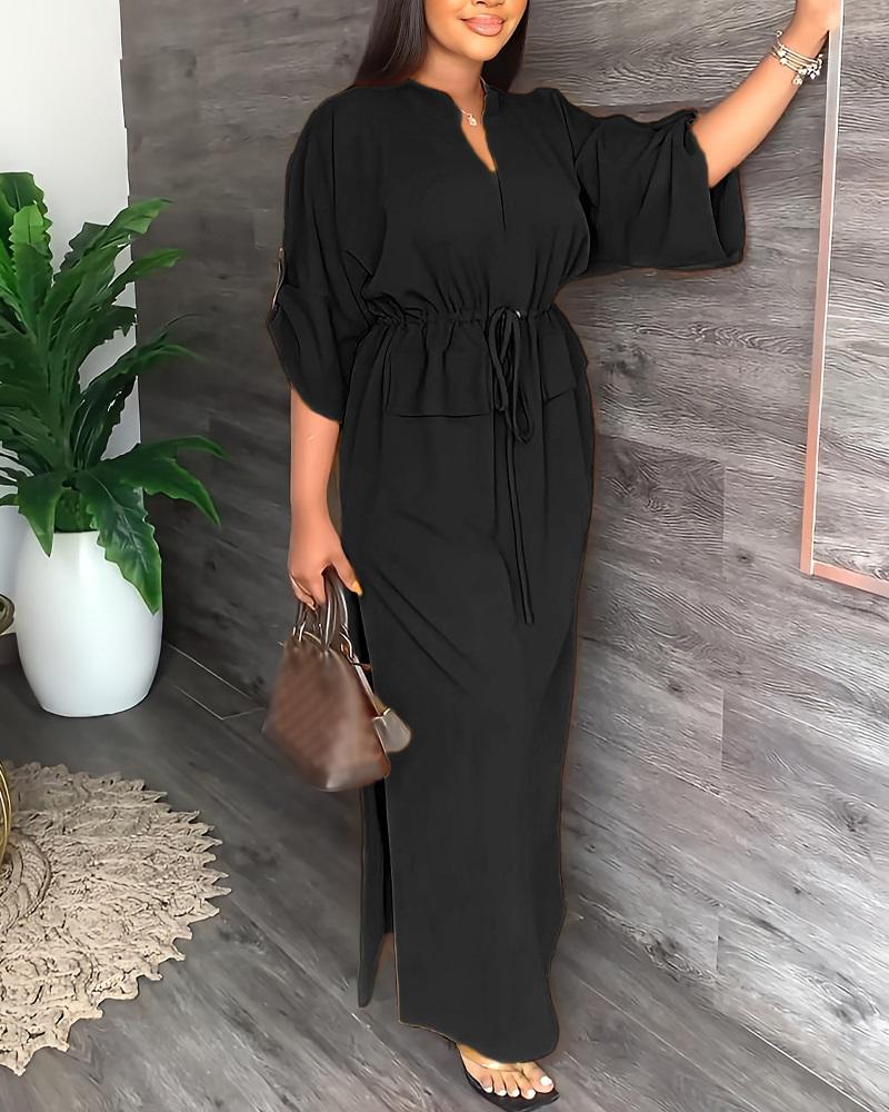 Style:Casual Type:Straight Material:Polyester Neckline:V-Cut Sleeve Style:Roll Up Sleeve,Three Quarters Length:Maxi Pattern Type:Plain Decoration:Drawstring,Slit Fit Type:Regular Occasion:Daily Package Include:1* Dress Fabric Elasticity:Slight Stretch Sheer:No Care Instructions:Machine wash or professional dry clean