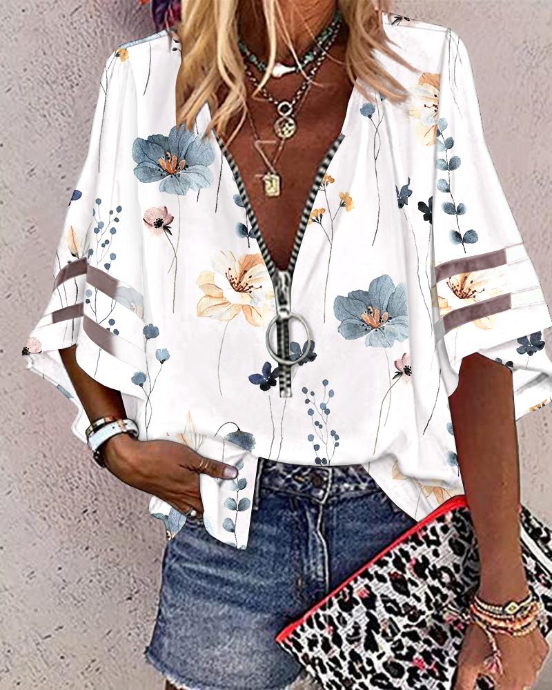 Style:Casual Type:Blouses Material:97%Polyester,3%Spandex Neckline:V-Neck Sleeve Style:Three Quarters Length:Regular Pattern Type:Floral Decoration:Sheer Mesh,Zipper Fit Type:Regular Occasion:Daily,Vacation Package Include:1* Blouse Fabric Elasticity:Slight Stretch Sleeve Type:Bell Sleeve Sheer:No Care Instructions:Machine wash or professional dry clean