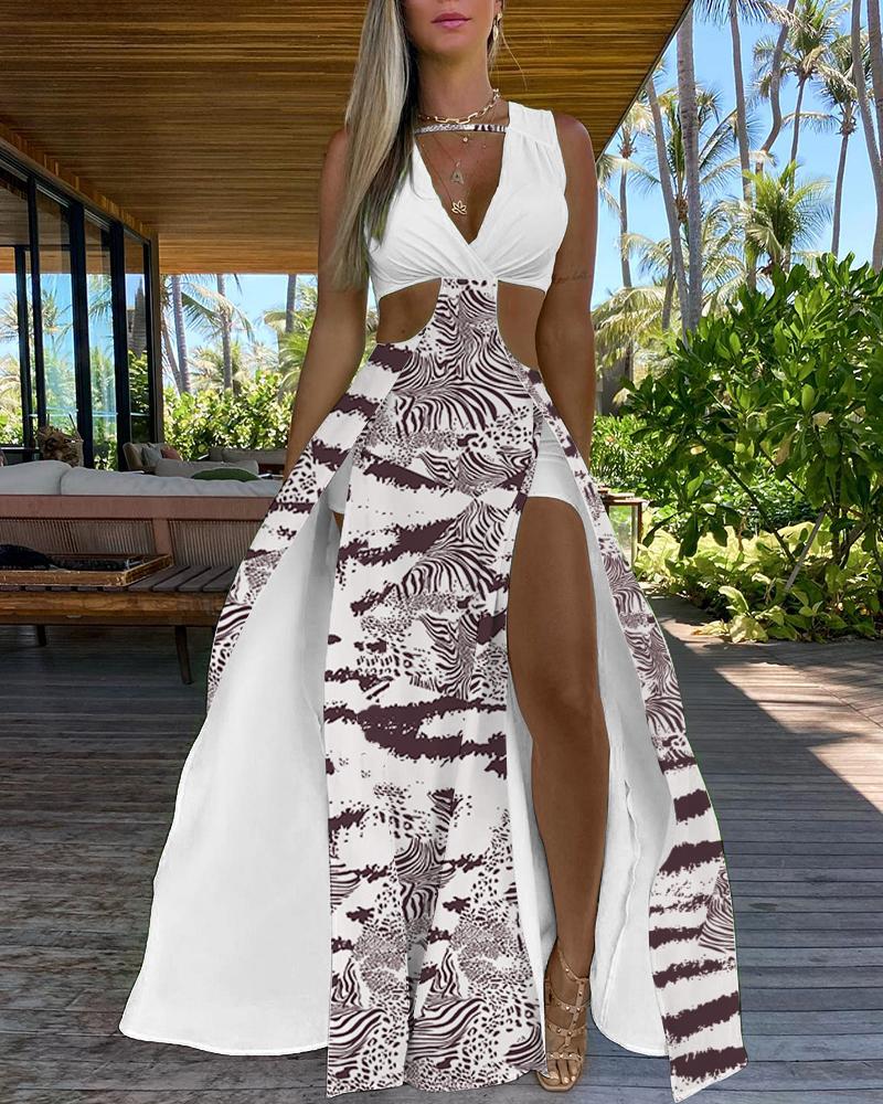 Style:Chic,Sexy Type:Slit Material:100%Polyester Neckline:V-Neck Sleeve Style:Sleeveless Length:Maxi Pattern Type:Tie Dye,Zebra Stripe Decoration:Cutout Fit Type:Regular Occasion:Daily,Vacation Package Include:1* Dress Fabric Elasticity:Slight Stretch Sheer:No Care Instructions:Machine wash or professional dry clean Waist Line:High Waist