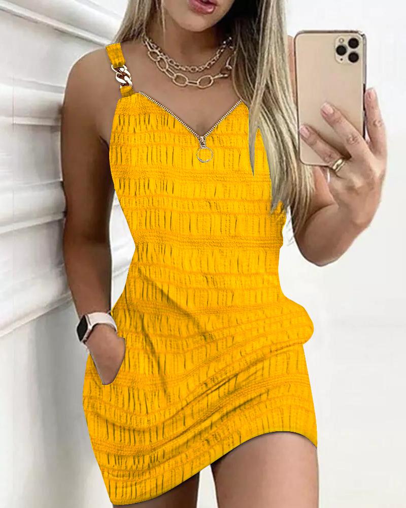 Style:Casual Type:Straight Material:100%Polyester Neckline:V-Neck Sleeve Style:Sleeveless Length:Mini Pattern Type:Plain Decoration:Chain,Pocket,Zipper Fit Type:Regular Occasion:Daily,Vacation Package Include:1* Dress Fabric Elasticity:Slight Stretch Sheer:No Care Instructions:Machine wash or professional dry clean