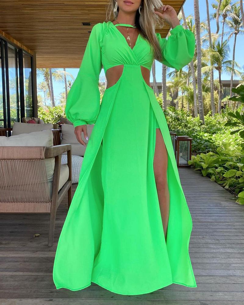 Style:Casual,Chic Type:Slit Material:100%Polyester Neckline:V-Neck Sleeve Style:Lantern Sleeve,Long Sleeve Length:Maxi Pattern Type:Plain Decoration:Backless,Cutout,Lantern Sleeve,Slit,Tied Detail Fit Type:Regular Occasion:Daily,Vacation Package Include:1* Dress
