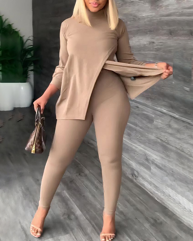 Long Sleeve Slit Top & High Waist Pants Set