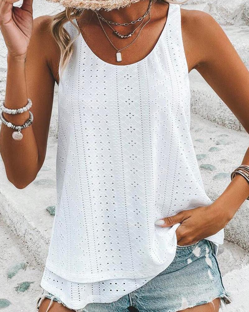 Style:Casual Type:Tank Material:97%Polyester,3%Spandex Neckline:Scoop Neck Sleeve Style:Sleeveless Length:Regular Pattern Type:Plain Decoration:Eyelet Embroidery Fit Type:Regular Occasion:Daily Package Include:1*Top Fabric Elasticity:Medium Stretch Sheer:No Care Instructions:Machine wash or professional dry clean