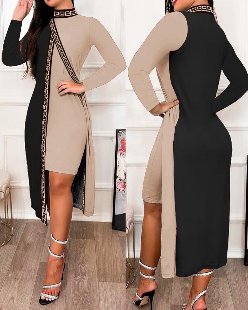Style:Casual Type:Asymmetrical Material:95%Polyester,5%Elastane Neckline:Mock Neck Sleeve Style:Long Sleeve Length:Asymmetrical Pattern Type:Colorblock,Geometric Decoration:Slit Fit Type:Regular Occasion:Daily Package Include:1* Dress Fabric Elasticity:Non-Stretch Sheer:No Care Instructions:Machine wash or professional dry clean