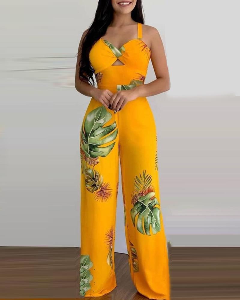Style:Casual Type:Jumpsuit Material:100%Polyester Neckline:V-Neck Sleeve Style:Sleeveless Length:Long Pattern Type:Plants Decoration:Cutout Fit Type:Regular Occasion:Daily,Vacation Package Include:1*Jumpsuit Fabric Elasticity:Slight Stretch