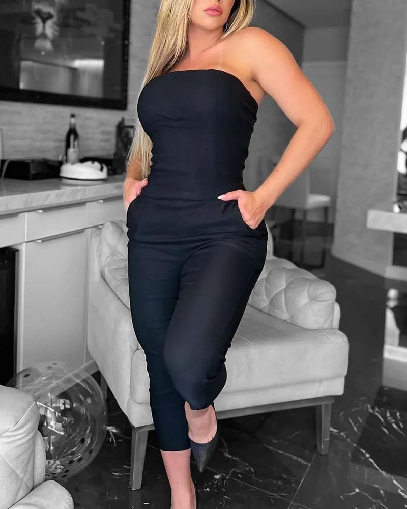 Style:Chic Type:Jumpsuit Material:95%Polyester,5%Elastane Neckline:Bandeau Sleeve Style:Long Sleeve Length:Long Pattern Type:Plain Decoration:Pocket Fit Type:Regular Occasion:Daily Package Include:1*Jumpsuit