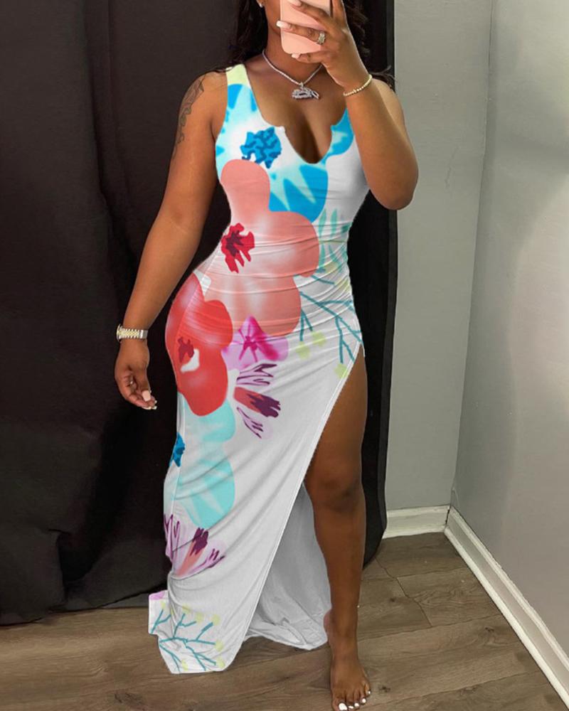 Floral Print Notched Neck High Slit Maxi Dress