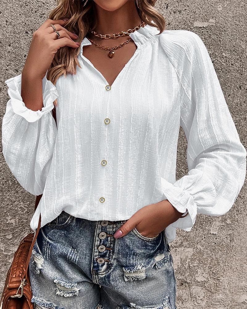 Style:Chic Type:Blouses Material:Polyester Neckline:Stand Collar Sleeve Style:Long Sleeve Length:Regular Pattern Type:Plain Decoration:Frill Hem Fit Type:Regular Occasion:Daily Package Include:1* Blouse Fabric Elasticity:Slight Stretch Sleeve Type:Lantern Sleeve Sheer:No Care Instructions:Machine wash or professional dry clean