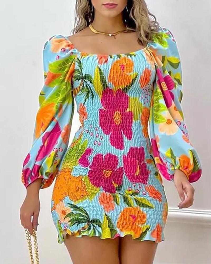 Style:Casual Type:Bodycon Material:100%Polyester Neckline:Square Neck Sleeve Style:Long Sleeve,Puff Sleeve Length:Mini Pattern Type:Tropical Decoration:Shirred Fit Type:Skinny Occasion:Daily Package Include:1* Dress Fabric Elasticity:Slight Stretch
