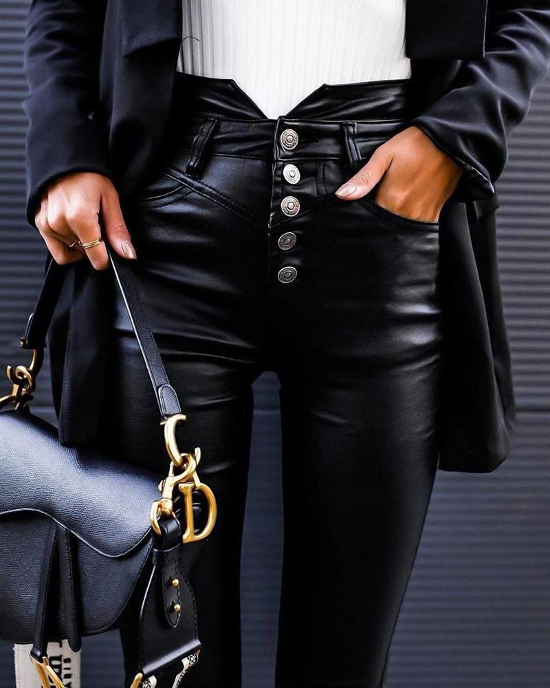Button Front Pocket Design PU Leather Pants