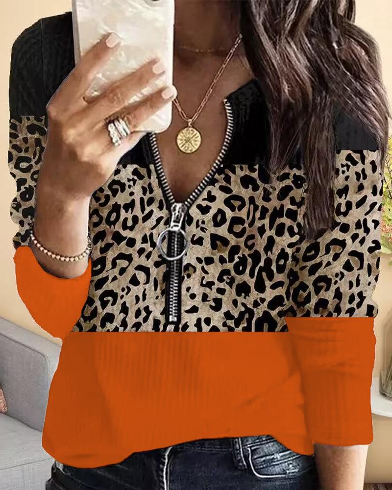 Style:Casual Type:Tee Material:97%Polyester,3%Spandex Neckline:Round Neck Sleeve Style:Long Sleeve Length:Regular Pattern Type:Colorblock,Leopard Decoration:Zipper Fit Type:Regular Occasion:Daily Package Include:1*Top
