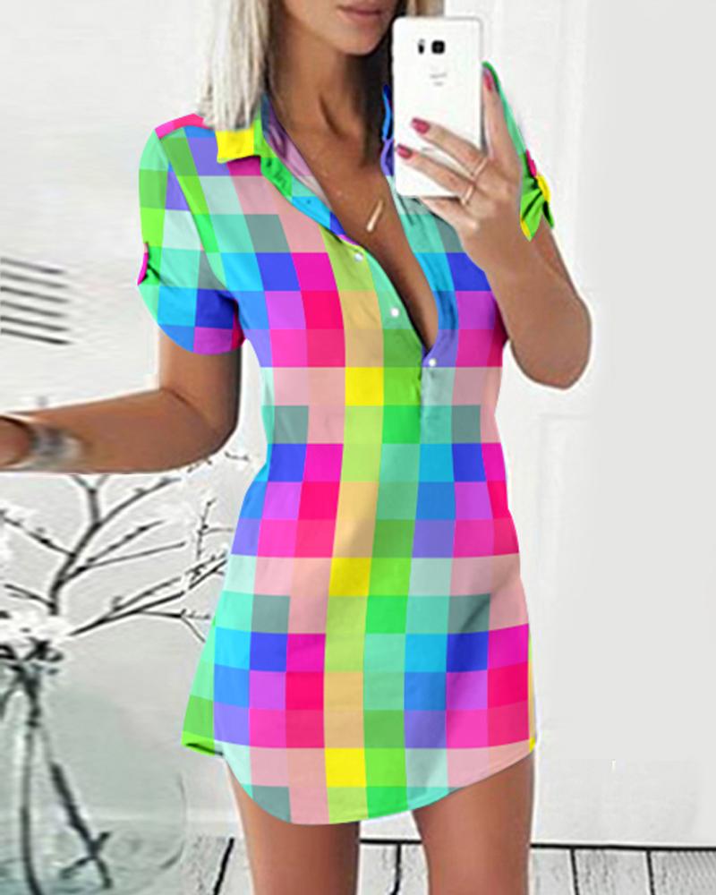 Style:Casual,Chic Type:Shirt Material:100%Polyester Neckline:Turn-down Collar Sleeve Style:Short Sleeve Length:Mini Pattern Type:Colorblock,Plaid Decoration:Button Fit Type:Regular Occasion:Daily Package Include:1* Dress Fabric Elasticity:Slight Stretch