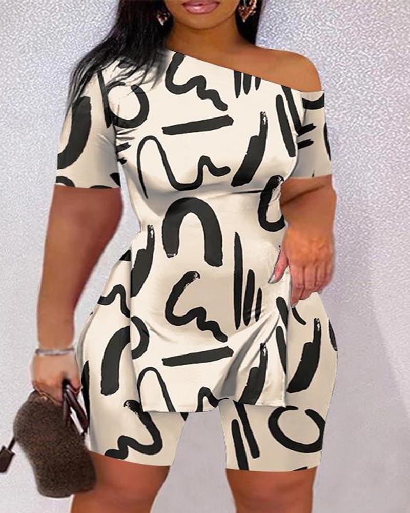 Style:Casual Type:Shorts Set Material:97%Polyester,3%Spandex Neckline:Skew Neck Sleeve Style:Short Sleeve Length:Above Knee Pattern Type:Abstract,Random Print Decoration:Slit Fit Type:Regular Occasion:Daily Package Include:1*Shorts Set Fabric Elasticity:Non-Stretch