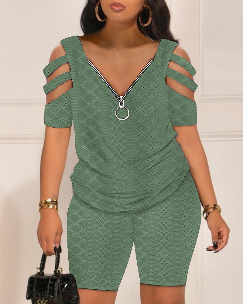 Style:Casual Type:Shorts Set Material:97%Polyester,3%Spandex Neckline:Cold Shoulder Sleeve Style:Short Sleeve Length:Above Knee Pattern Type:Plain Decoration:Eyelet Embroidery,Zipper Fit Type:Regular Occasion:Daily Package Include:1*Shorts Set Fabric Elasticity:Medium Stretch Sheer:No Care Instructions:Machine wash or professional dry clean