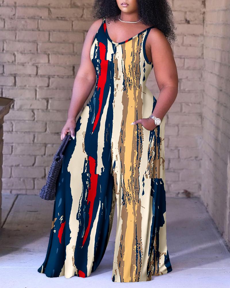 Plus Size Abstract Print Striped Pocket Design Jumpsuit