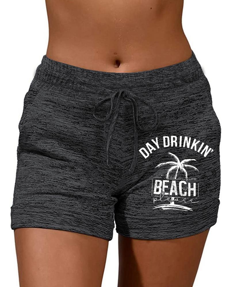 Coconut Tree Letter Landscape Print Drawstring Shorts