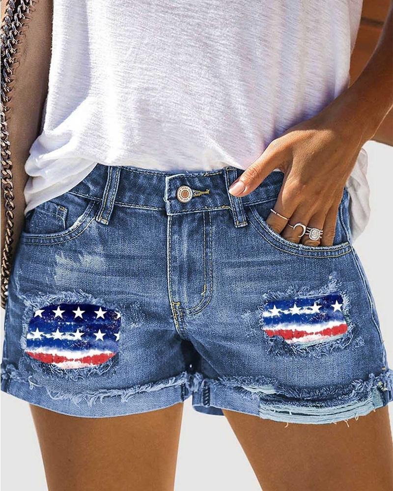 Independence Day Flag Print Ripped Raw Hem Denim Shorts