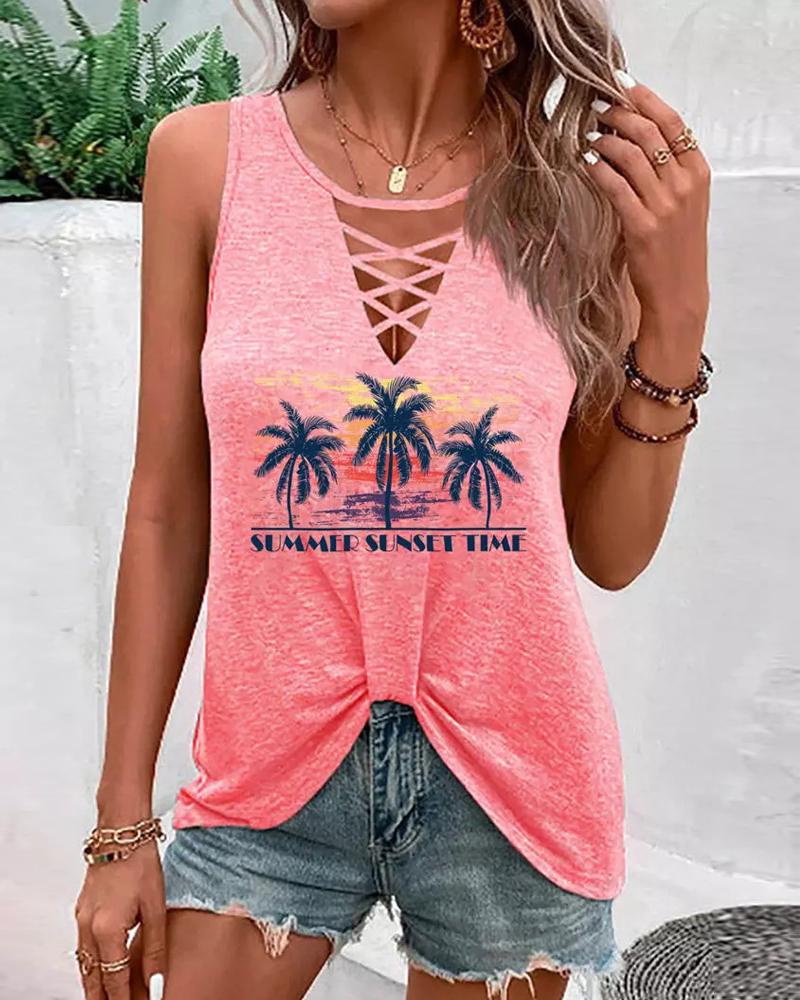 Coconut Tree Letter Print Cutout Tank Top