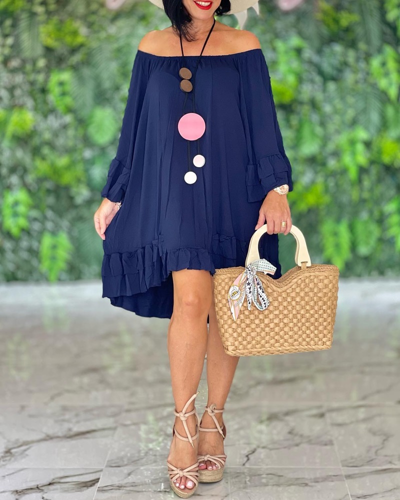Style:Chic Type:A Line Material:100%Polyester Neckline:Off the Shoulder Sleeve Style:Long Sleeve Length:Asymmetrical Pattern Type:Plain Decoration:Ruffles Fit Type:Regular Occasion:Daily Package Include:1*Dress Fabric Elasticity:Non-Stretch Sheer:No Care Instructions:Machine wash or professional dry clean Waist Line:Natural
