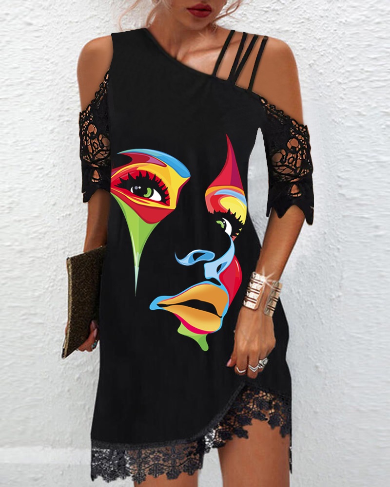 Style:Casual,Chic Type:A Line Material:97%Polyester,3%Spandex Neckline:Asymmetrical Neck Sleeve Style:Short Sleeve Length:Mini Pattern Type:Figure Decoration:Contrast Lace Fit Type:Regular Occasion:Daily Package Include:1* Dress