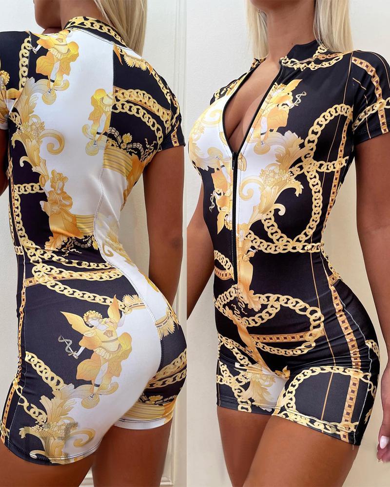 Baroque Chain Print Zip Detail Short Sleeve Romper