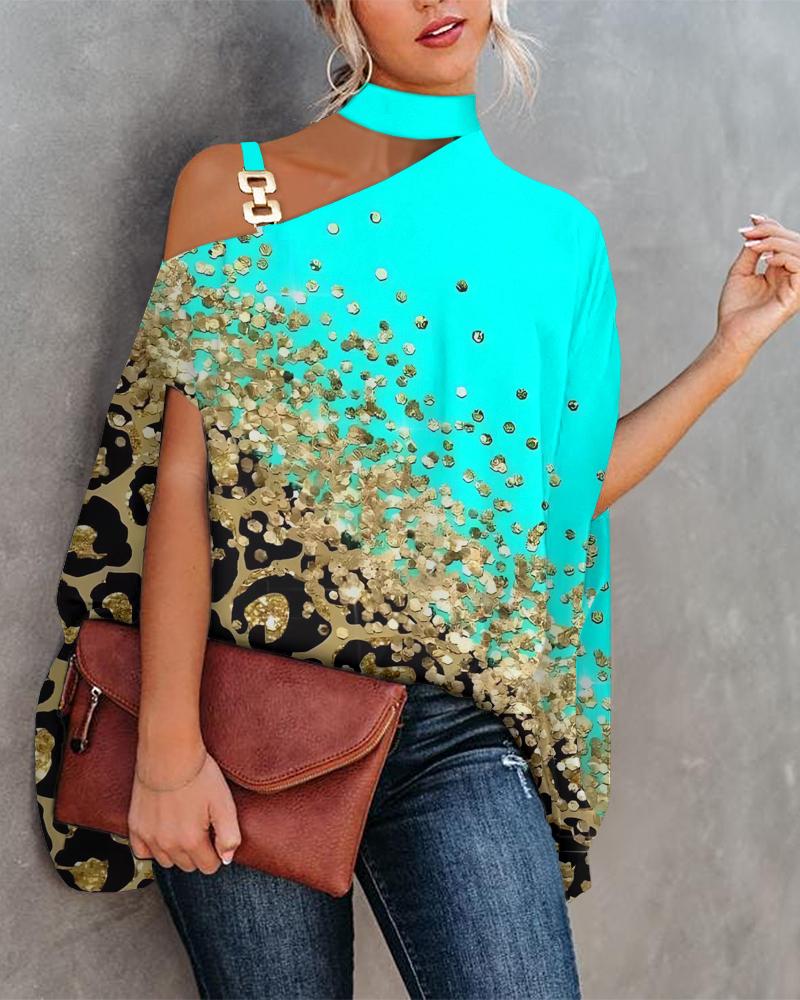 Contrast Leopard Print Cold Shoulder Chain Decor Top