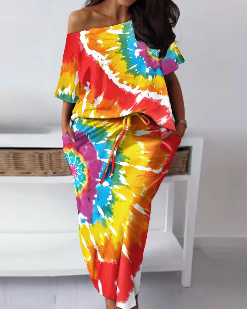 Style:Casual Type:Skirt Sets Material:97%Polyester,3%Spandex Neckline:Skew Neck Sleeve Style:Short Sleeve Length:Maxi Pattern Type:Tie Dye Decoration:Drawstring,Pocket Fit Type:Regular Occasion:Daily Package Include:1*Skirt Set Fabric Elasticity:Non-Stretch Sheer:No Care Instructions:Machine wash or professional dry clean Waist Line:High Waist