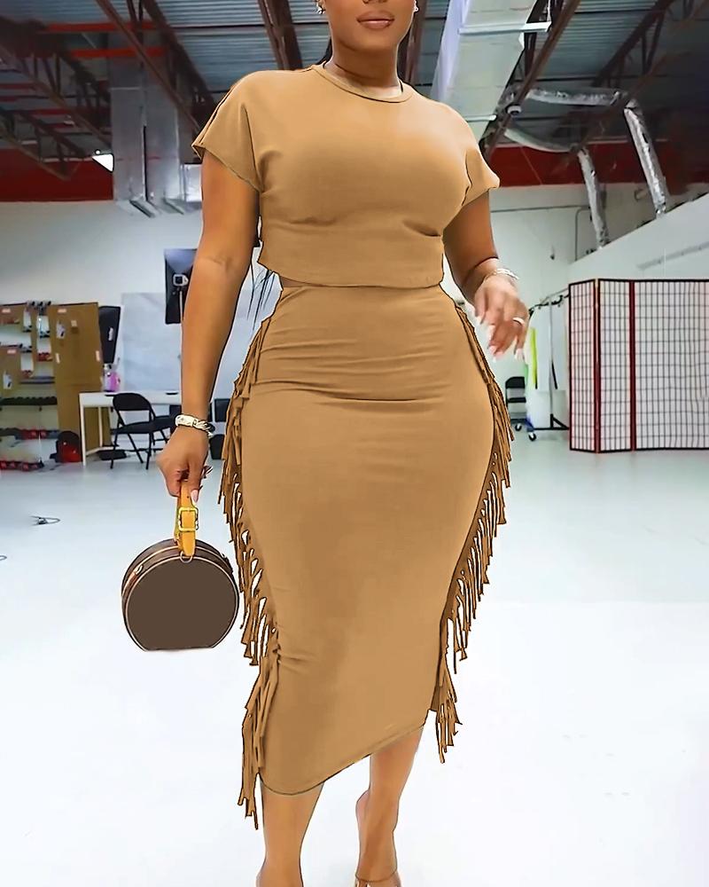 Crop T-shirt & Tassel Design High Waist Skirt Set