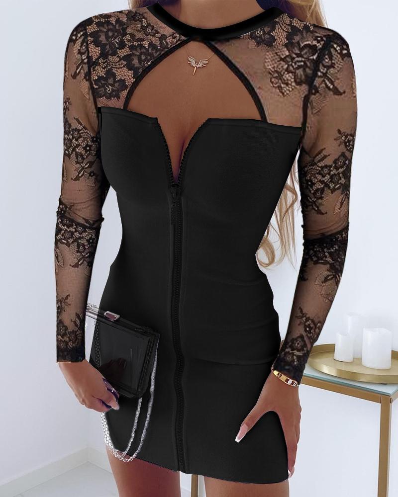 Contrast Lace Zipper Design Cutout Bodycon Dress