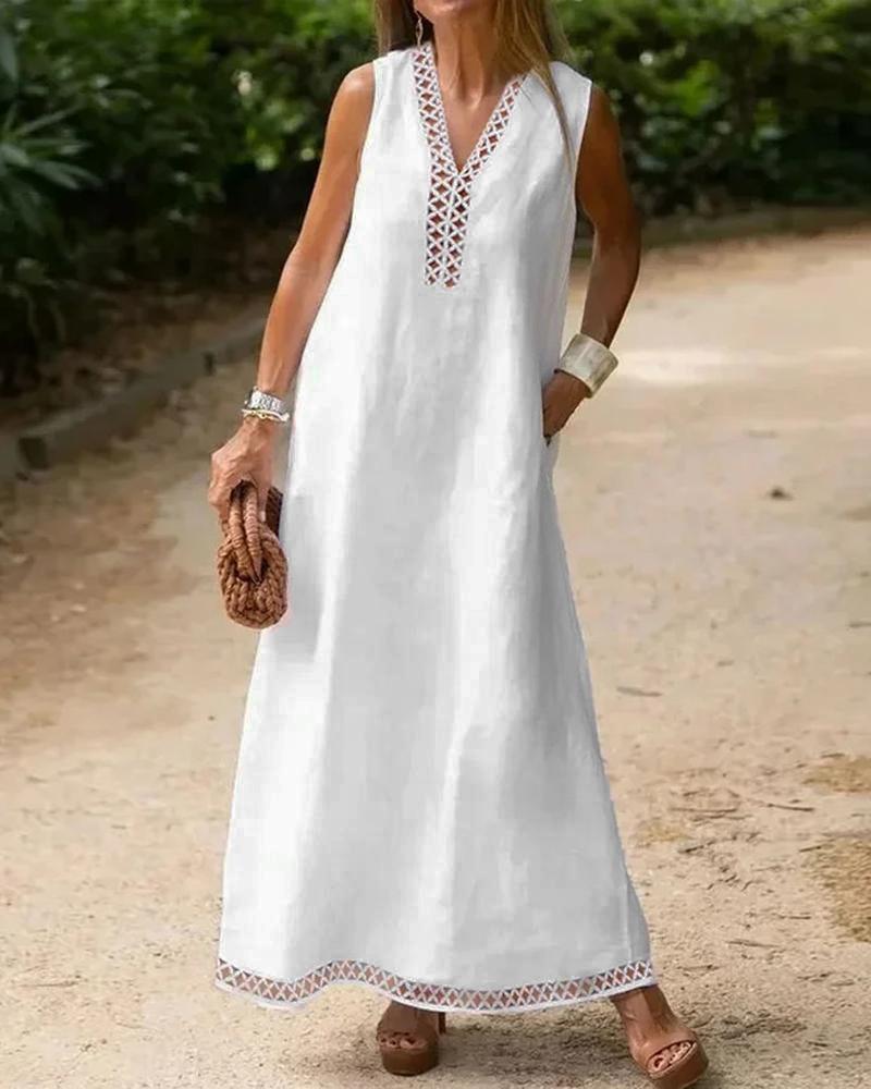 Style:Casual Type:Flared Material:100%Polyester Neckline:V-Neck Sleeve Style:Sleeveless Length:Maxi Pattern Type:Plain Decoration:Contrast Lace,Hollow-out Fit Type:Regular Occasion:Daily,Vacation Package Include:1* Dress