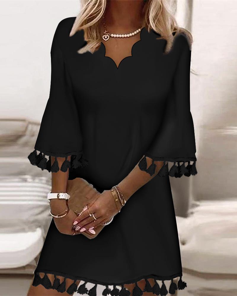 Style:Casual Type:Straight Material:100%Polyester Neckline:V-Neck Sleeve Style:Bell Sleeve,Three Quarters Length:Mini Pattern Type:Plain Decoration:Scallop,Tassel Fit Type:Regular Occasion:Daily,Vacation Package Include:1* Dress