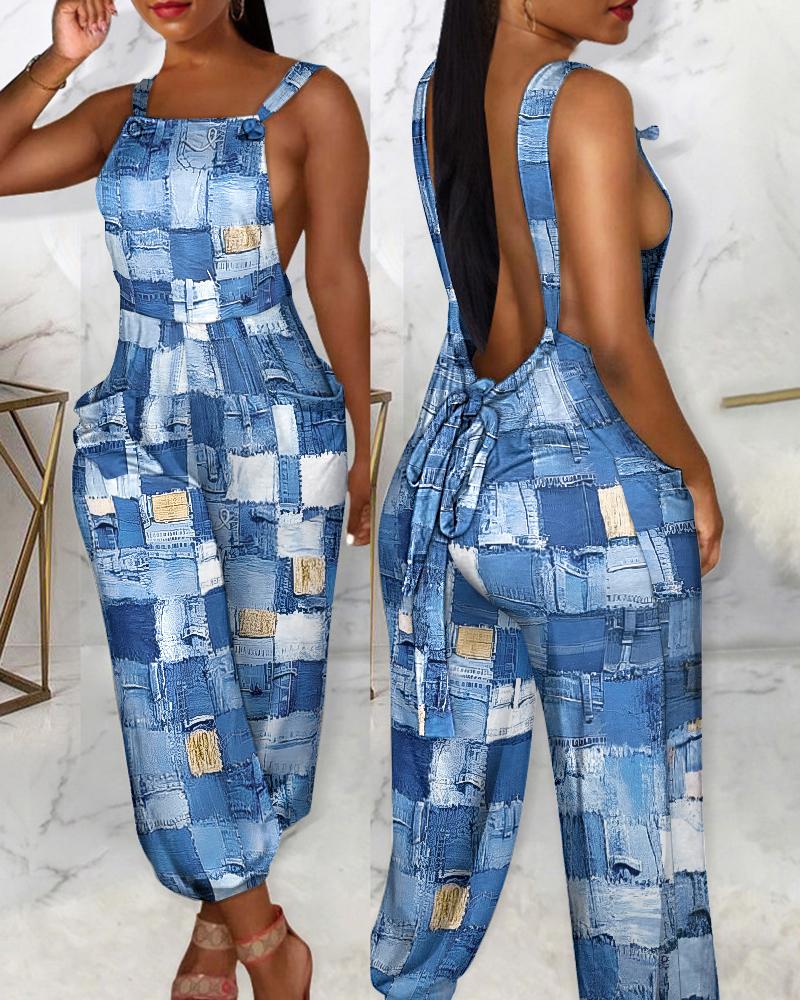 Style:Casual Type:Jumpsuit Material:97%Polyester,3%Spandex Neckline:Square Neck Sleeve Style:Sleeveless Length:Long Pattern Type:All Over Print Decoration:Backless,Pocket,Tied Detail Fit Type:Regular Occasion:Daily Package Include:1*Jumpsuit