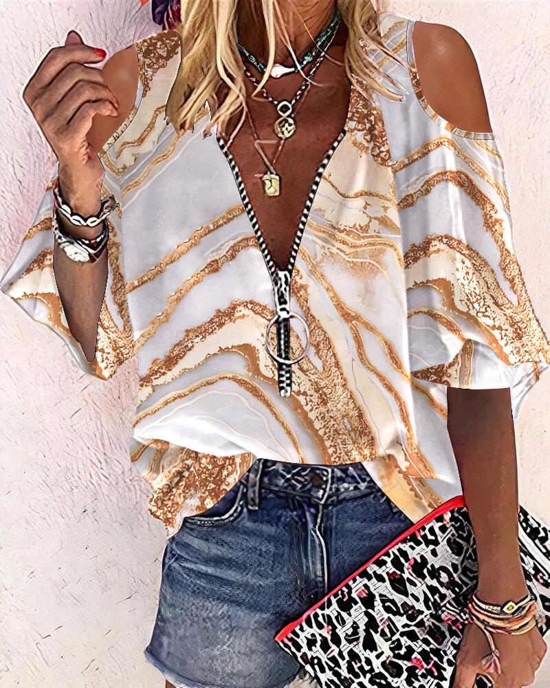 Marble Print Zip Front Cold Shoulder Top