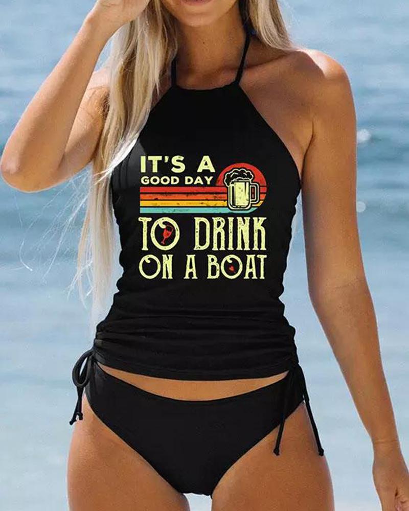 Coconut Tree Print Drawstring Ruched Halter Tankini Set
